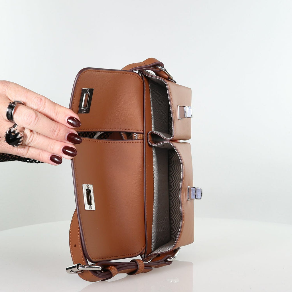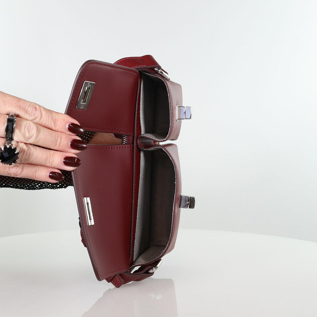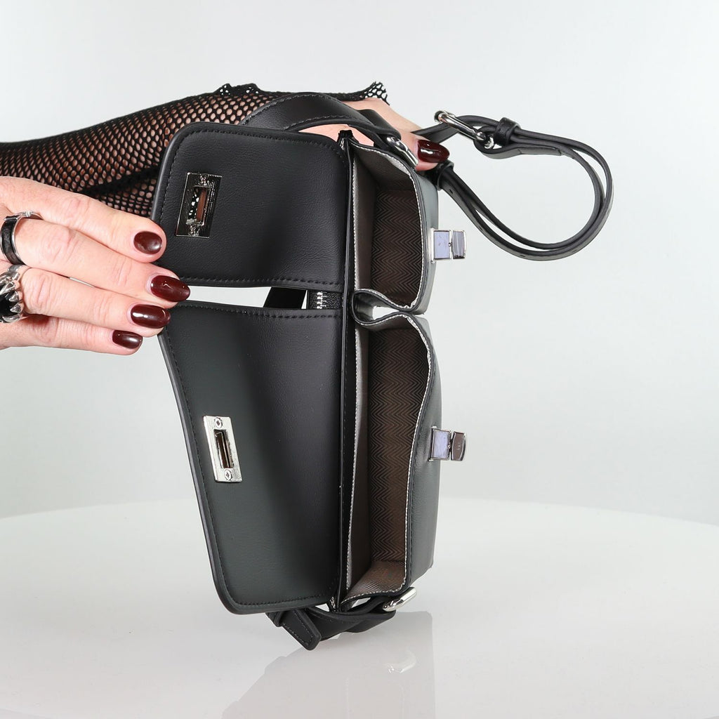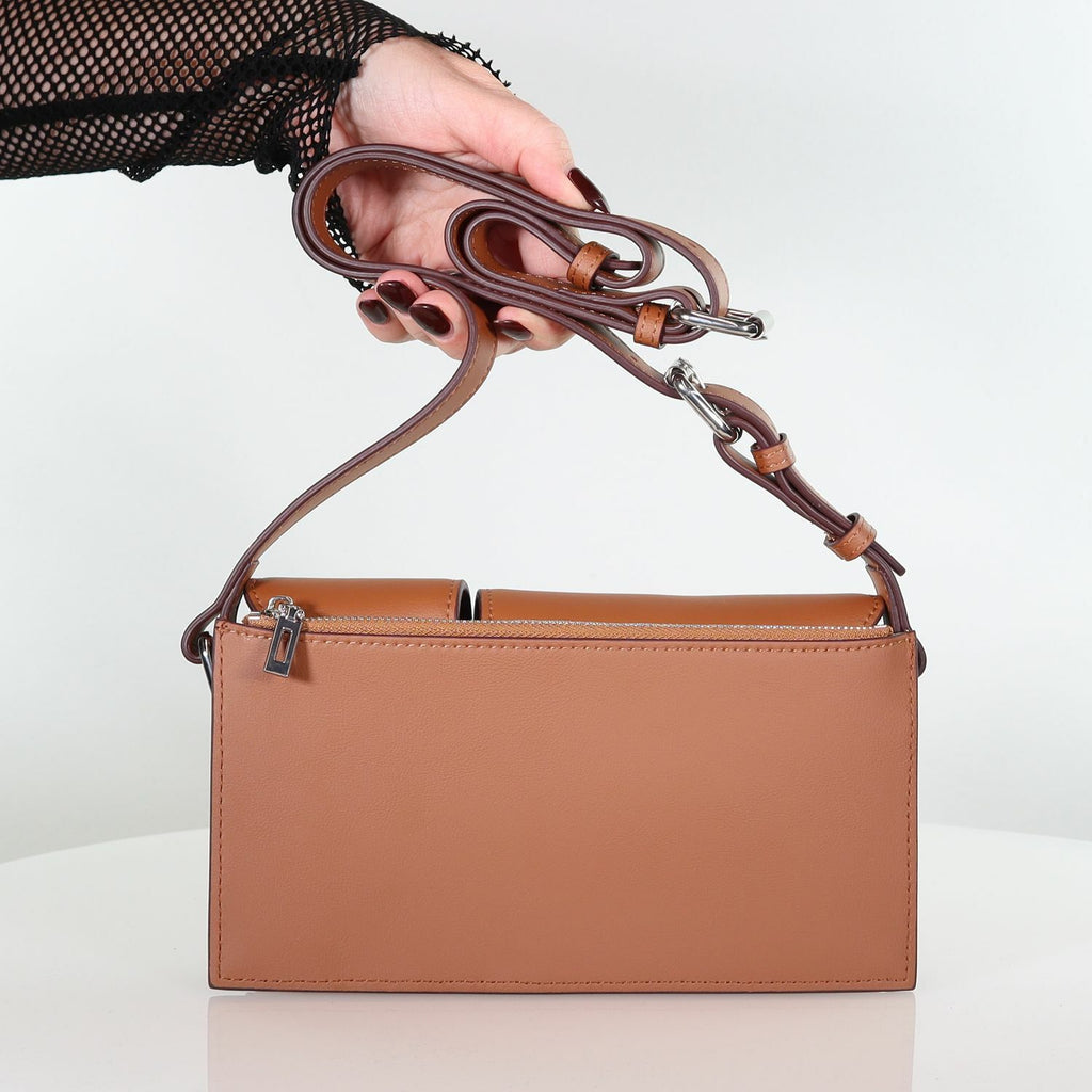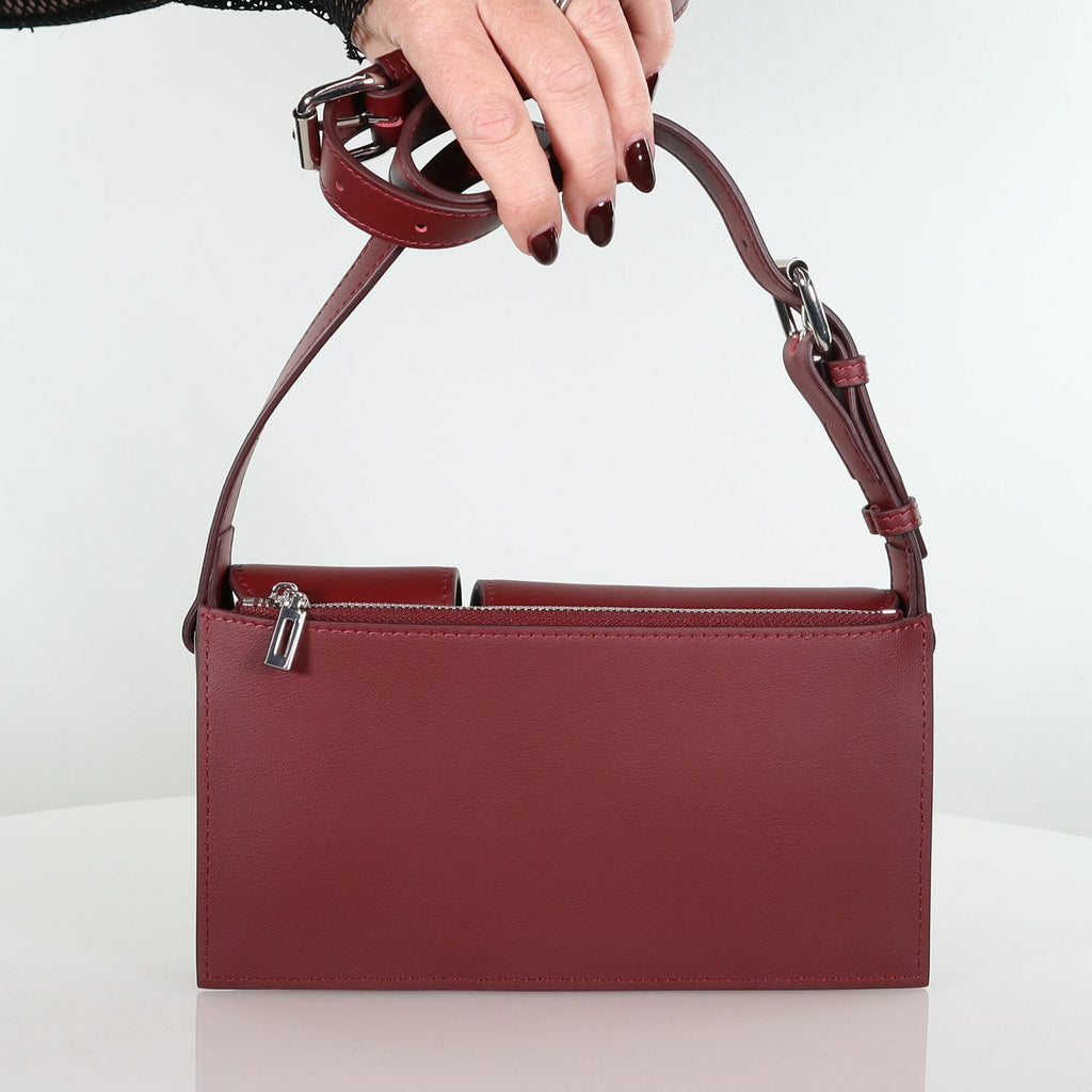 Don’t let the size fool you, this little bag is a funky feature crossbody perfect for lunches or events. Crafted from 100 percent coated leather with shiny silver hardware, it features a cool front design with two silver pockets for small essentials and a wallet-sized zip pocket at the back for your valuables. With three compartments including two open pockets and an adjustable crossbody strap, it’s the playful statement piece your outfit has been waiting for.