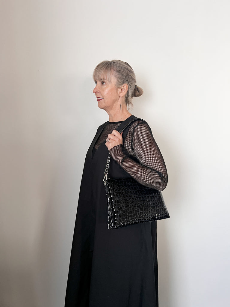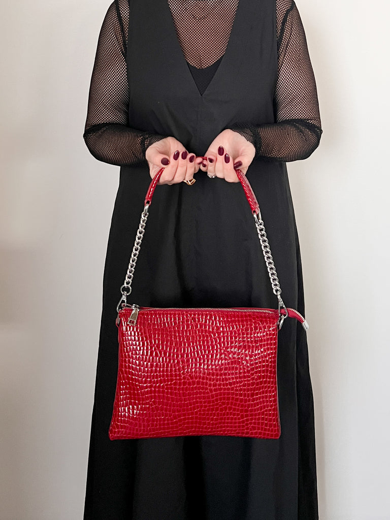 The Vogue Bag is a sleek statement piece crafted from luxe milled leathers and croc embossed high-shine patent for a true fashion moment. It features two straps, a practical crossbody for daytime and a leather and chain detail strap for glamorous nights out.