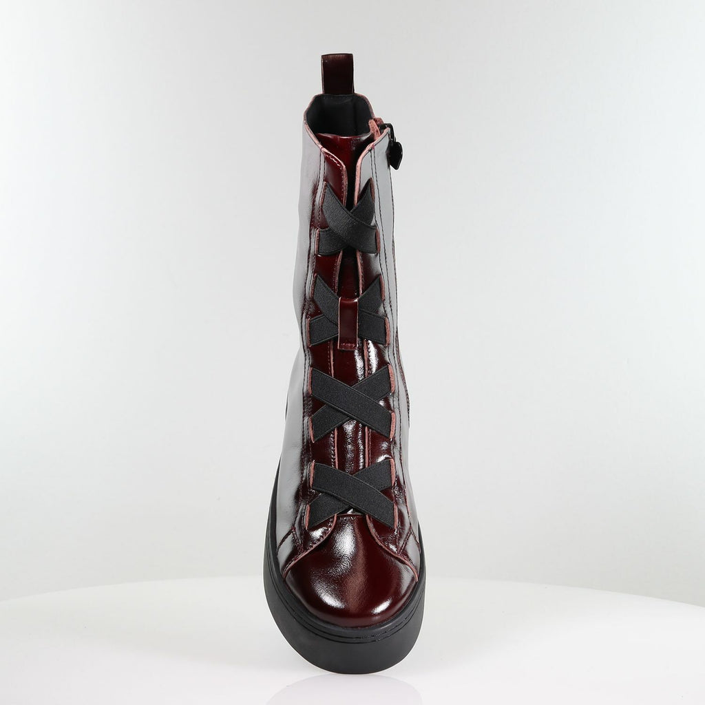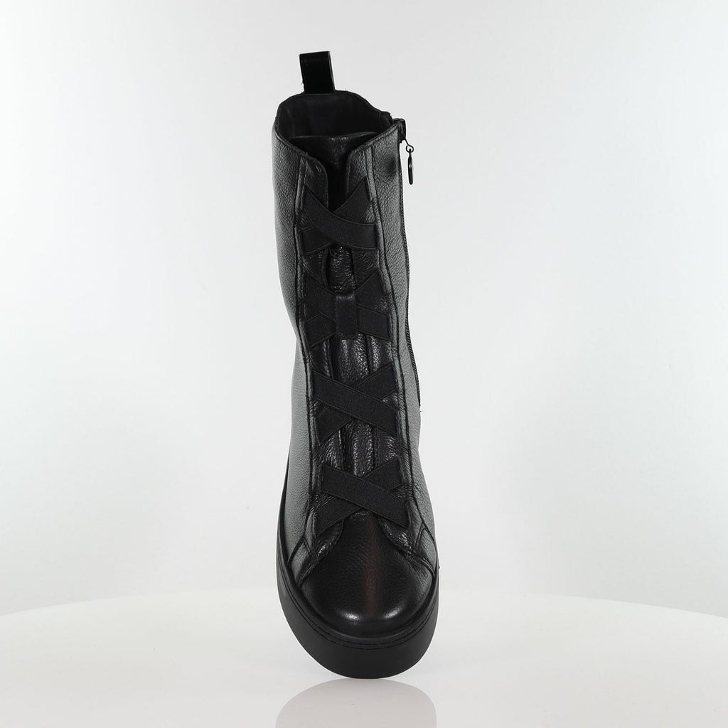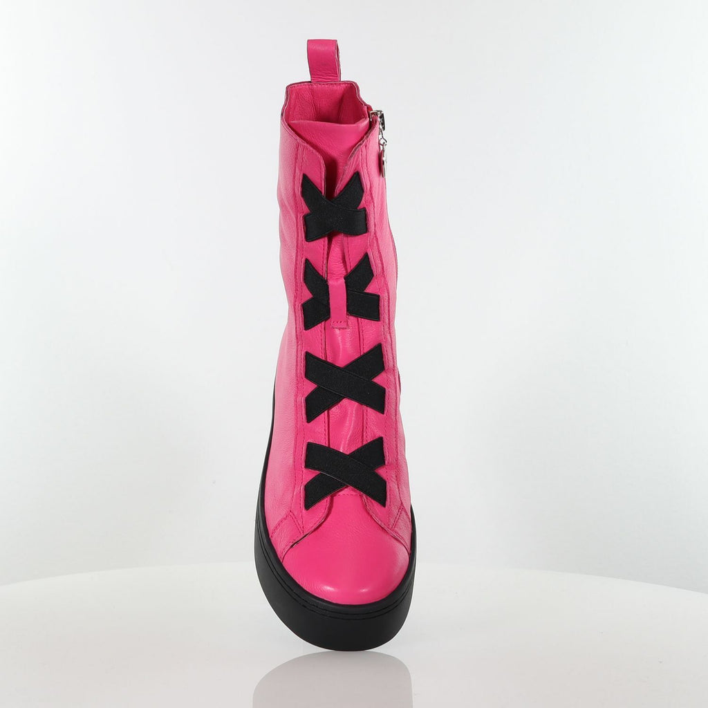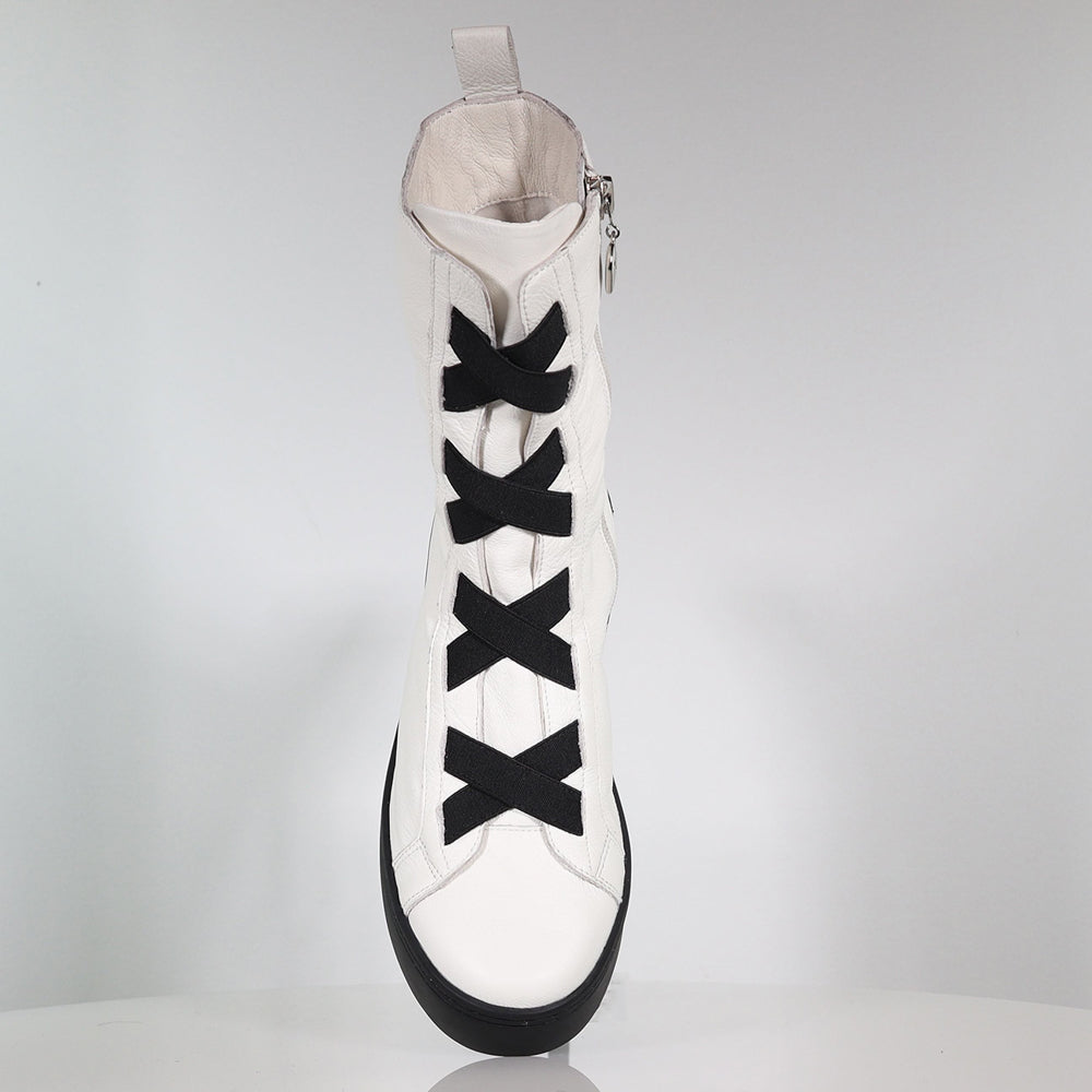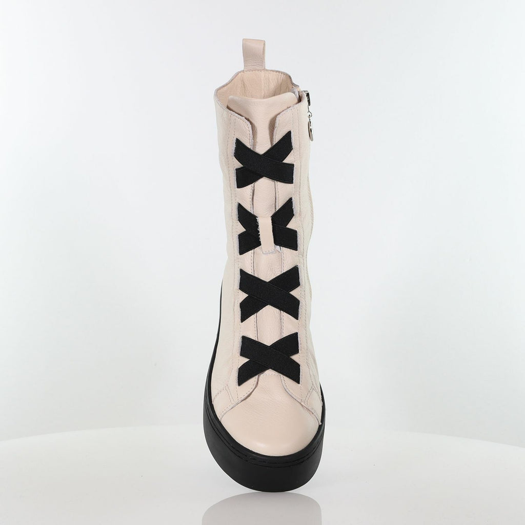 Introducing Katerina, the statement-making extra high-top trainer of the season. A bold fusion of ballet and boxing boot aesthetics, this striking design features a full leather upper with an exaggerated criss-cross front detail. The side zipper ensures easy wear, while the signature You Look Good platform sole delivers both height and attitude. Inside, the luxurious angel touch lining adds a layer of comfort, offering a soft, smooth feel. With its bold silhouette that extends up the leg, Katerina is the perfect pairing for ankle-length pants, mid-length skirts, or dresses—blurring the lines between daring street style and high-fashion drama.