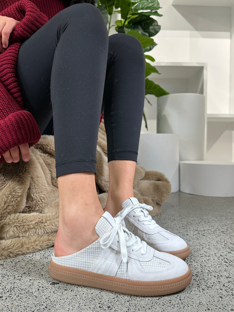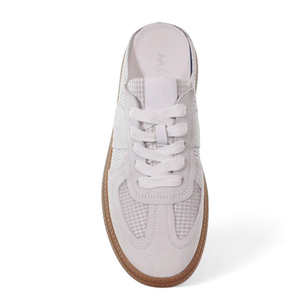 Chase me is the sneaker that slips on as easily as summer itself. This open-back style blends the fuss-free comfort of a mule with the street-smart look of a lace-up. Finished in soft suede leather with panelled detailing and a fresh new gum sole give it a modern, wearable finish.. Choose from camel suede and check accents or fresh white suede with a tonal check print. Lightweight, easy and endlessly wearable it keeps things breezy while still looking polished.