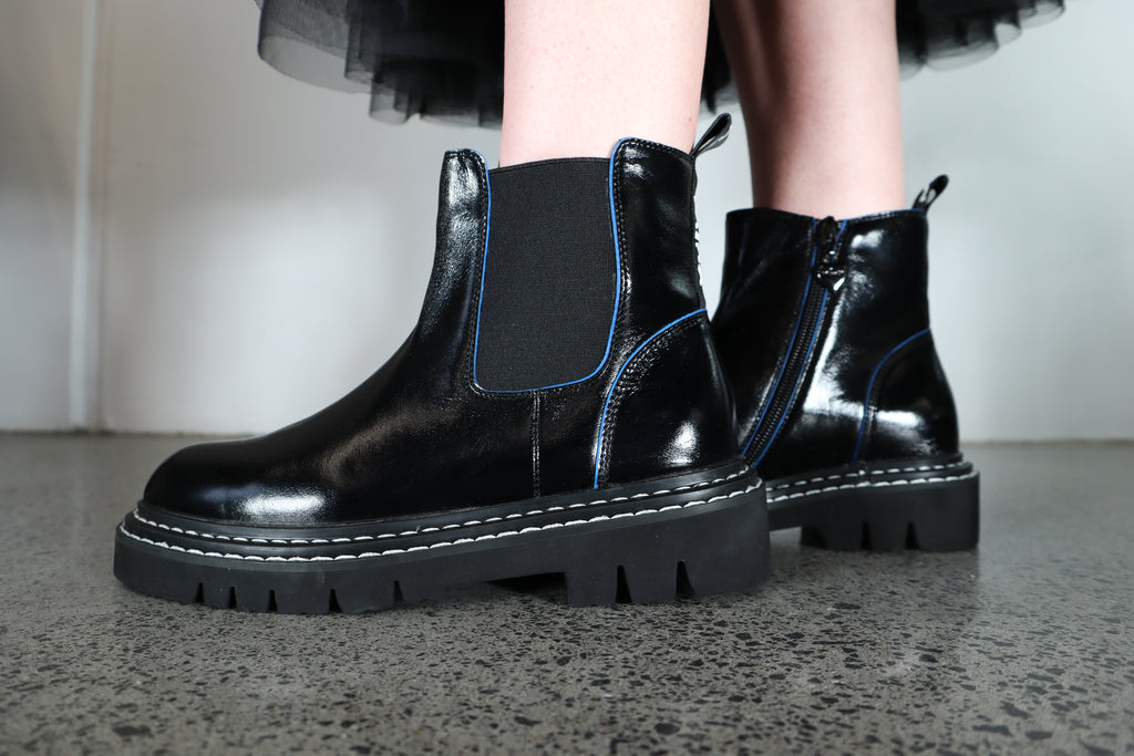 Introducing "Cali" - the Chelsea boot style crafted for seamless wear. This edgy ankle-length boot features a stretch side gusset and inside zipper for easy wear. Crafted from luxe oil leather, the black is detailed with vibrant cobalt color-pop stitching, while the Rosewood leather exudes an on-trend color palette option. The thick white double stitch rand with chunky tread silhouette gives these ankle boots a modern utilitarian edge. Versatile and stylish, 'Cali' transitions seamlessly through the seasons. Whether paired with autumn-inspired babydoll dresses or jeans and knits, it effortlessly elevates your wardrobe from autumn and beyond.