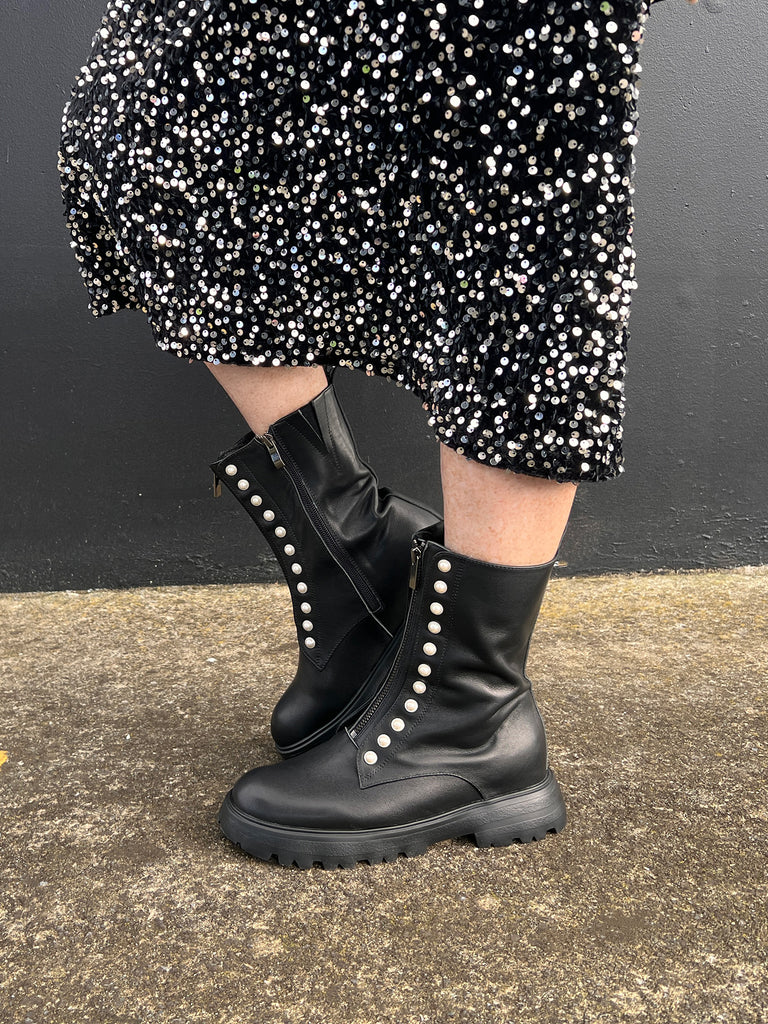 Step into Opal, a bold reinvention of a beloved Minx silhouette. Crafted in full leather, this elevated boot features both a front and side zipper for effortless entry, while 11 faux pearl embellishments add a touch of unexpected glamour. With a working elastic gusset for flexibility and comfort, Opal also boasts a lightweight rounded cleated sole for modern edge. Designed to sit higher on the leg, Opal pairs beautifully under winter skirts and dress hemlines, making it a versatile standout for the season. Available in Winter White and Black.