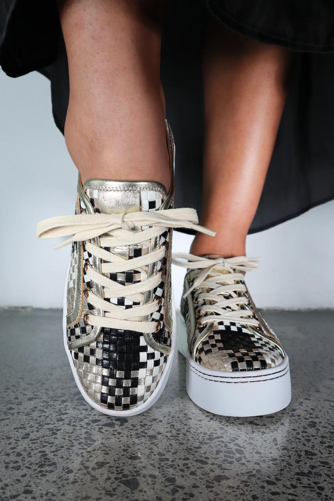 Introducing the Kellie Woven Sneaker, now available in a dazzling Multi metallic finish that makes it a standout choice. This sneaker features a unique three-color weave in gold, white, and black, complemented by gold eyelets and natural ivory laces, giving it a distinctive and fashionable edge. The "You Look Good" platform sole with sleek black stitching provides both elevated style and all-day comfort. Perfect for pairing with denim for a casual look or dressing up with black trousers for a special event.